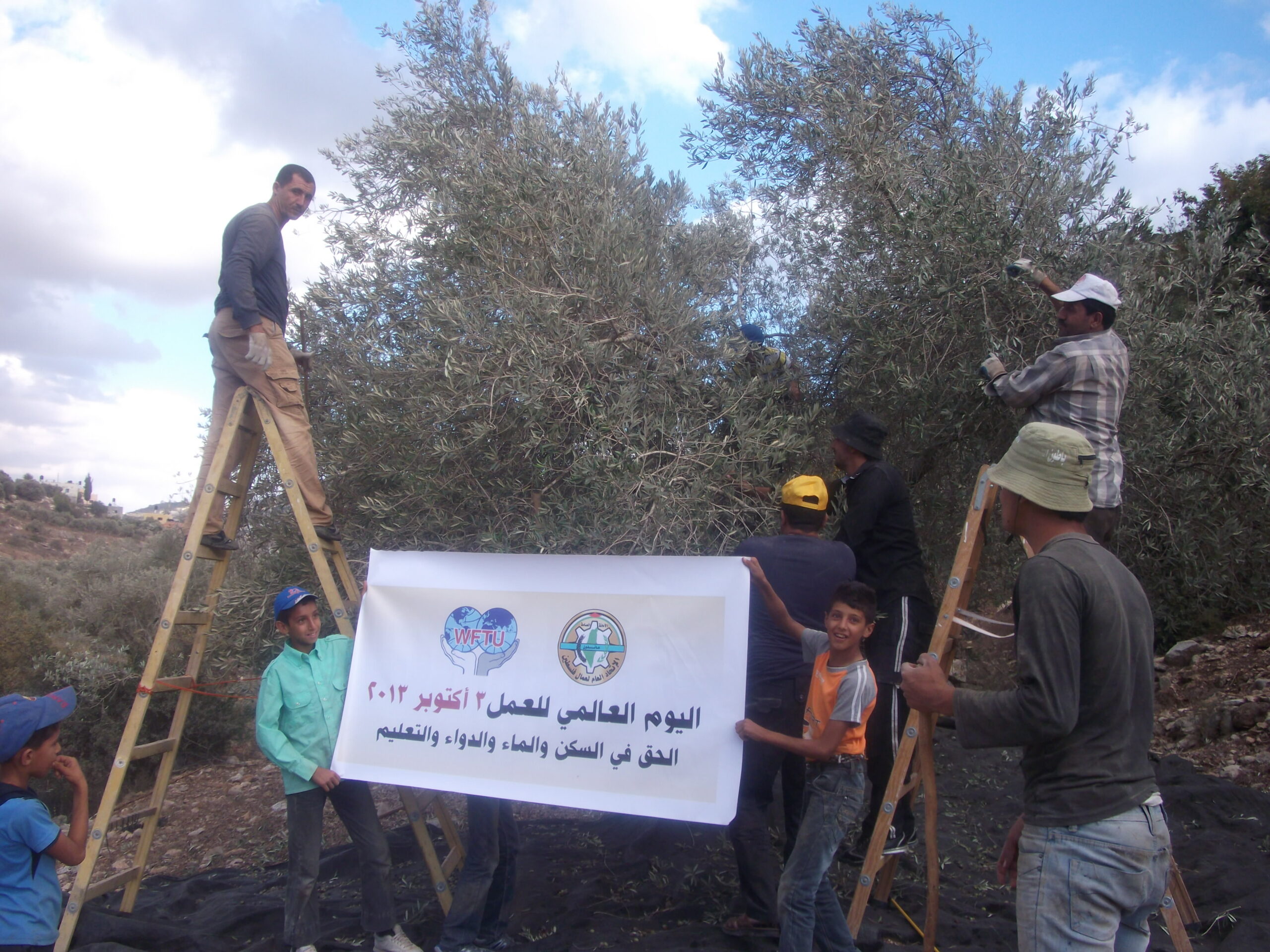 1- The General Federation visit to a site next to the apartheid wall in one of the villages of Jenin and work to help the people in the olive harvest threatened with confiscation by the Israeli army as a result of its proximity to the separation wall that Israel is building onPalestinian land.