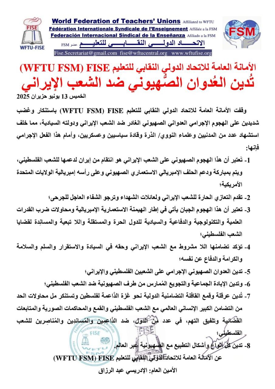 وقفت الأمانة العامة للاتحاد الدولي النقابي للتعليم (WFTU FSM) FISE باستنكار وغضب شديدين على الهجوم الإجرامي العدواني الصهيوني الغادر ضد الشعب الإيراني ودولته السيادية، مما خلف استشهاد عدد من المدنيين وعلماء النووي/ الذرة وقادة سياسيين وعسكريين، وأمام هذا الفعل الإجرامي فإنها:
