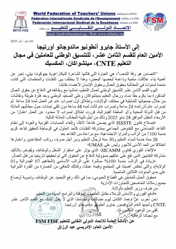 نحن نعرب عن دعمنا الكامل ليوم نضالكم، وتضامننا الذي لا يقبل الشك مع القسمالثامن عشر CNTE وأمينها العام البروفيسور جايرو أنطونيو ماندوجانو أورتيجا.