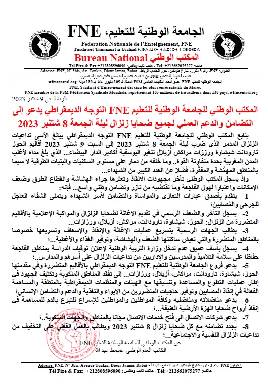 شاركها فيسبوك تويتر لينكدإن بينتيريست البريد الإلكتروني FNE-BUREAU-NATIONAL-SOLIDARITE-TREMBLEMENT-8_9-9-2023