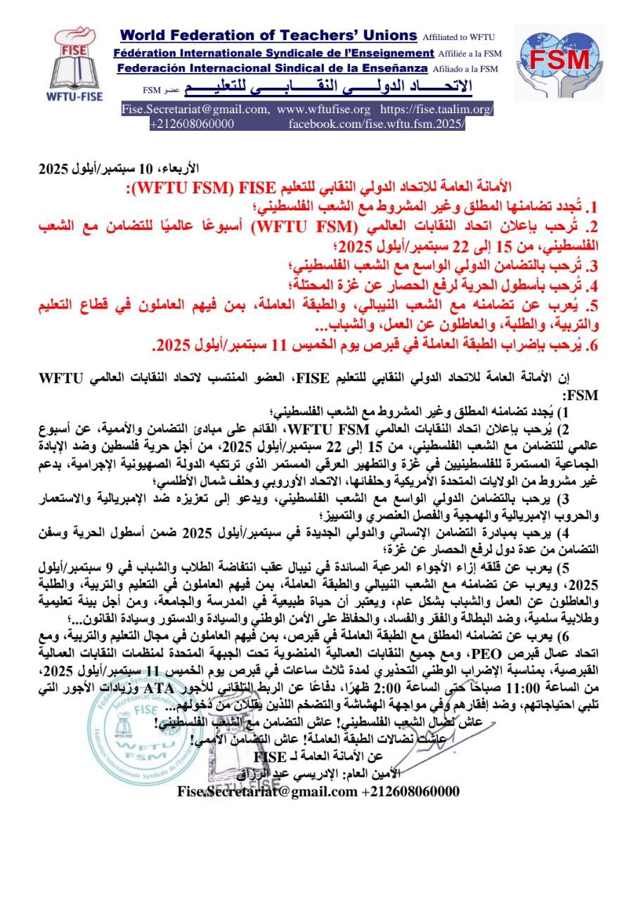 FISE FSM WFTU PALESTINE NEPAL CHYPRE WORLD INTERNATIONAL 10-9-2025