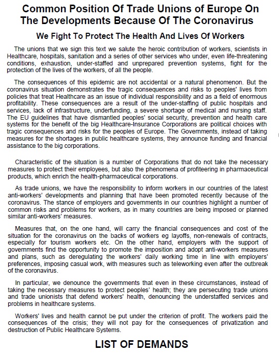 Share Facebook Twitter LinkedIn Pinterest Email 19.3.20 Common Position Of European Trade Unions On The Developments Because Of The Coronavirus- New List