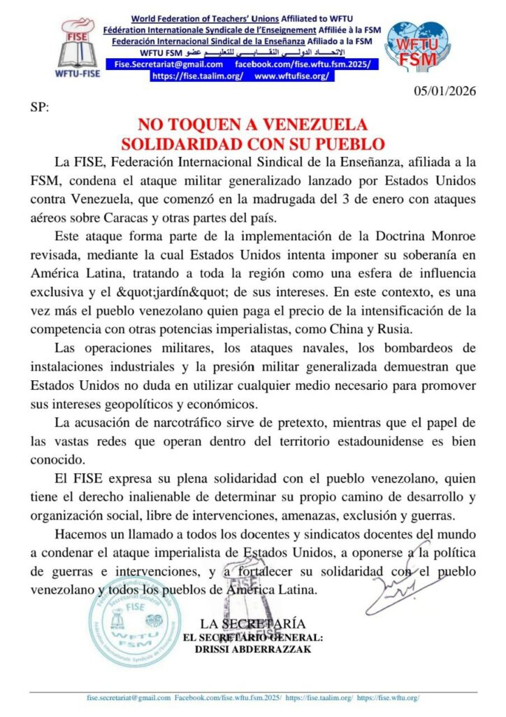 Hacemos un llamado a todos los docentes y sindicatos docentes del mundo a condenar el ataque imperialista de Estados Unidos, a oponerse a la política de guerras e intervenciones, y a fortalecer su solidaridad con el pueblo venezolano y todos los pueblos de América Latina.