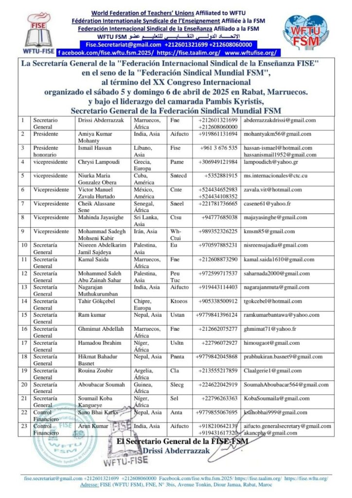 La Secretaría General de la «Federación Internacional Sindical de la Enseñanza FISE»