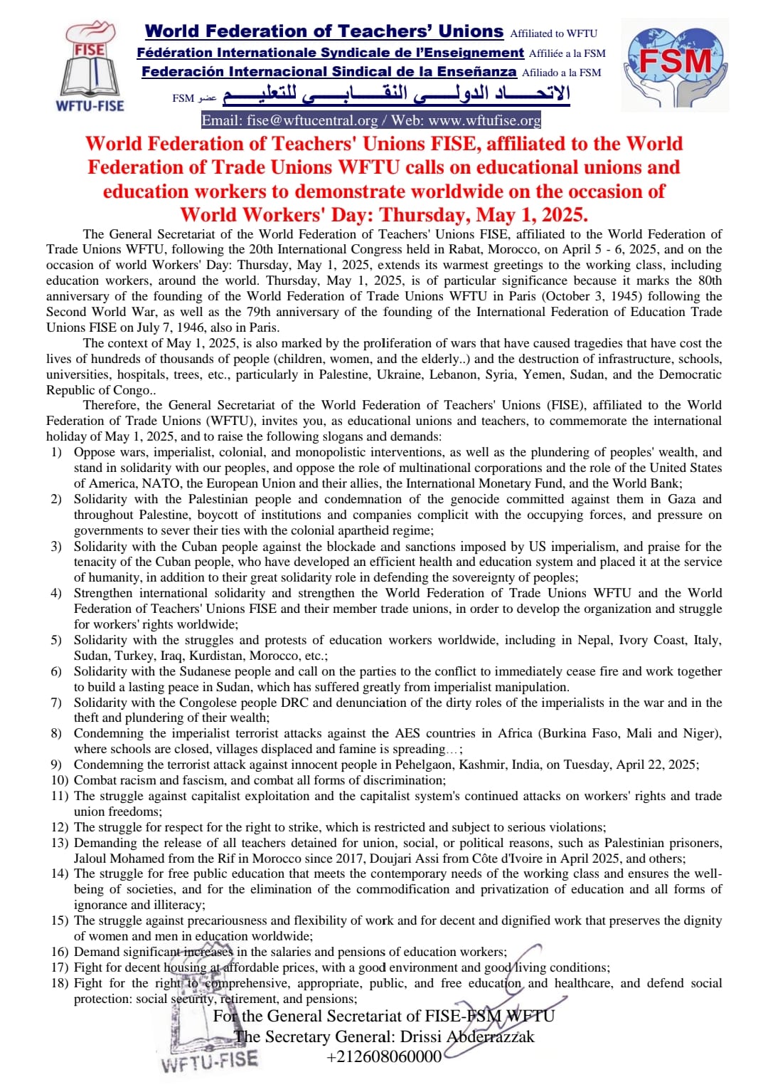 FISE (WFTU FSM) Regional Council for Africa: Reaffirms its commitment to class struggle and internationalist solidarity, March 1, 2026