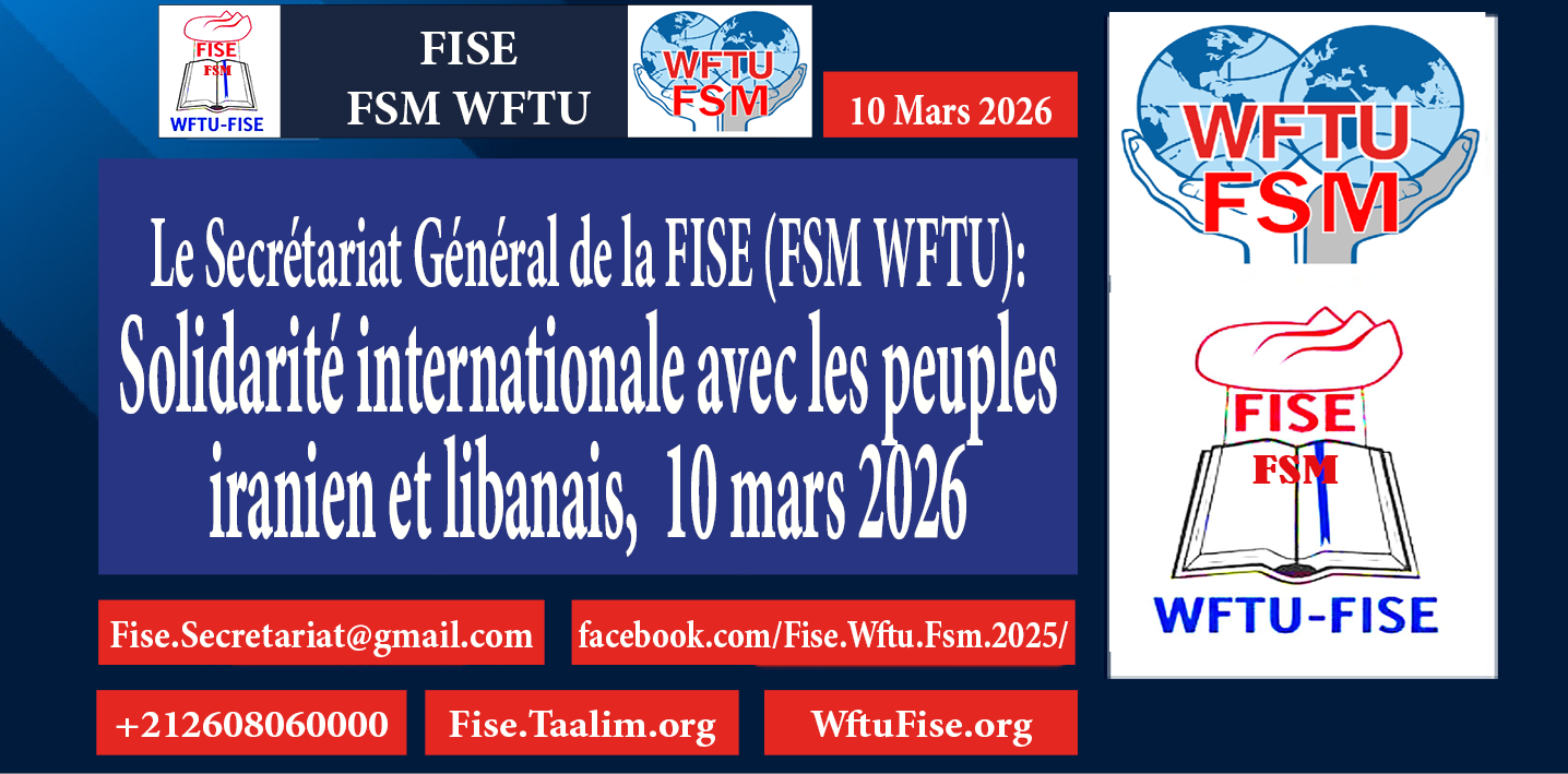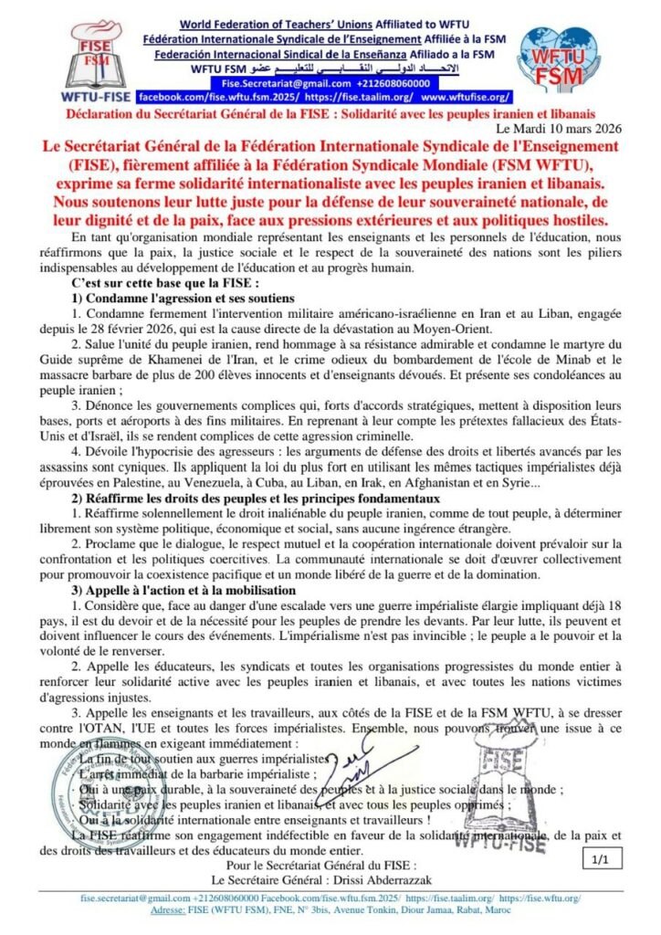 Le Secrétariat Général de la Fédération Internationale Syndicale de l’Enseignement (FISE), fièrement affiliée à la Fédération Syndicale Mondiale (FSM WFTU), exprime sa ferme solidarité internationaliste avec les peuples iranien et libanais. Nous soutenons leur lutte juste pour la défense de leur souveraineté nationale, de leur dignité et de la paix, face aux pressions extérieures et aux politiques hostiles.