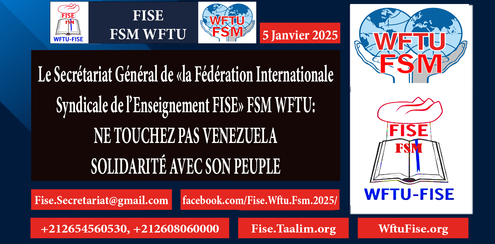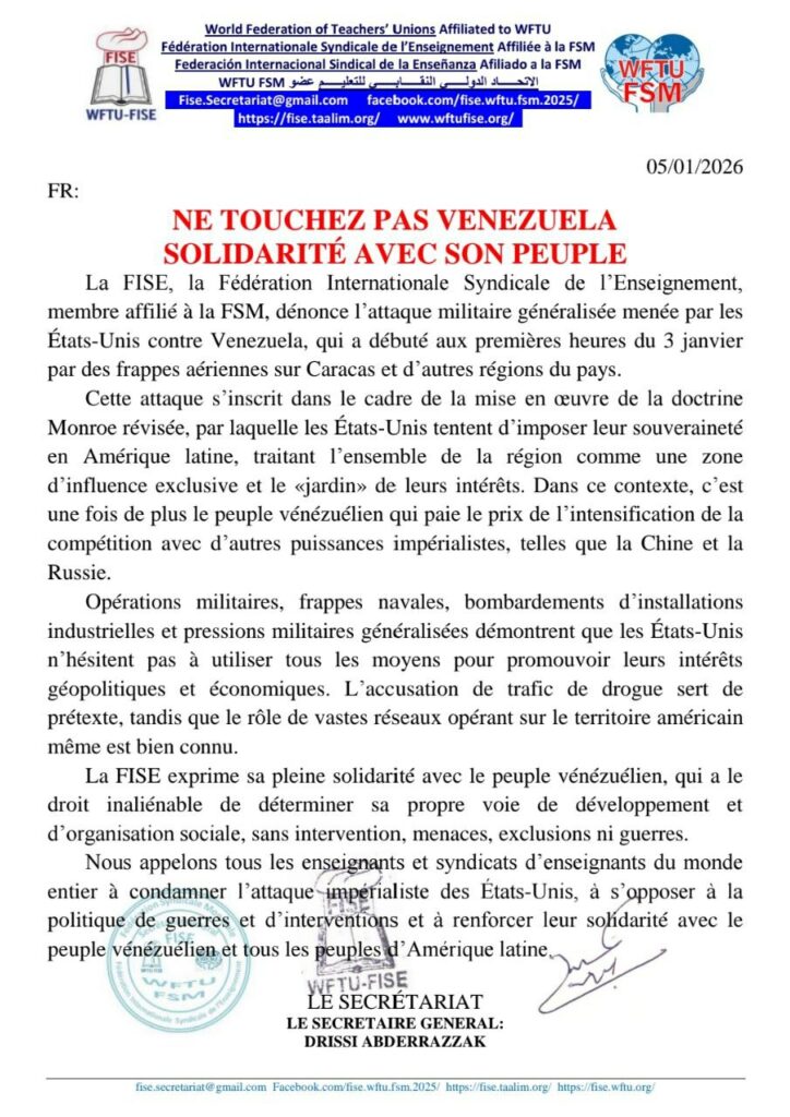 La FISE, la Fédération Internationale Syndicale de l’Enseignement, membre affilié à la FSM, dénonce l’attaque militaire généralisée menée par les États-Unis contre Venezuela, qui a débuté aux premières heures du 3 janvier par des frappes aériennes sur Caracas et d’autres régions du pays.