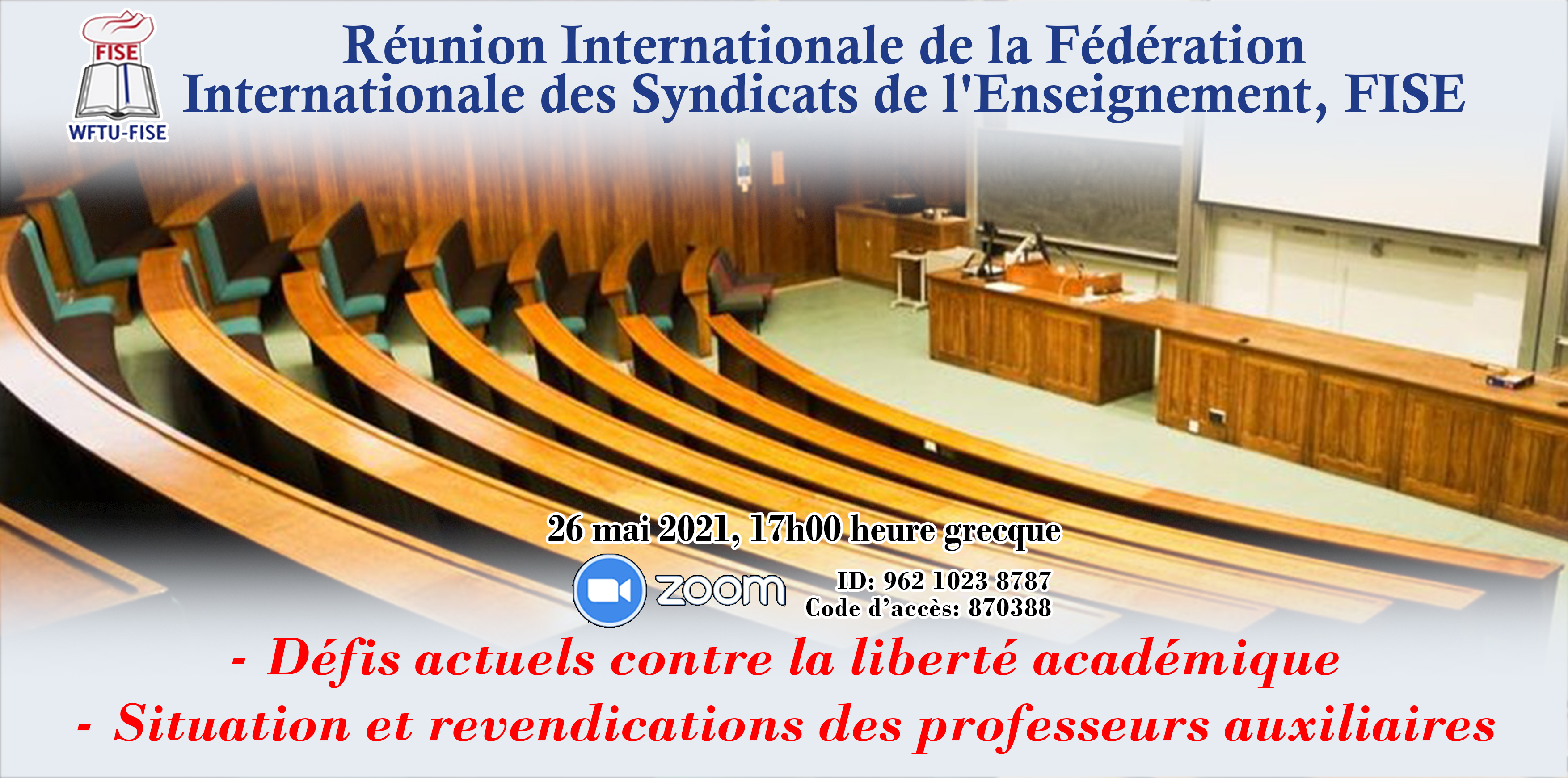 Nous vous invitons cordialement à une Réunion Internationale virtuelle de la Fédération Internationale des Syndicats de l’Enseignement, FISE, sur les sujets suivants: