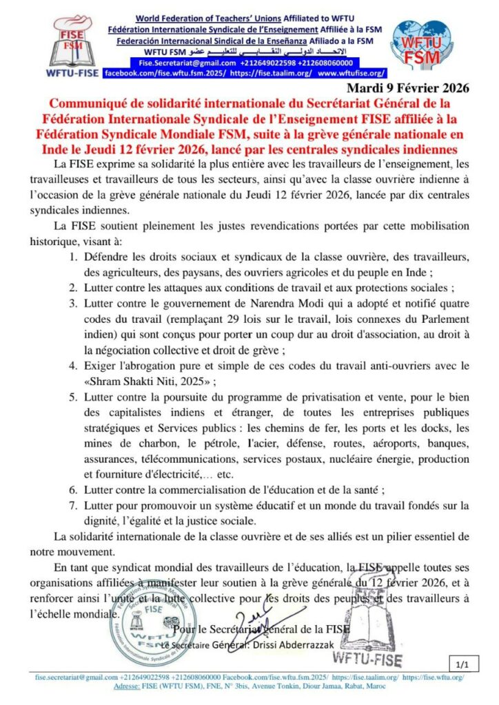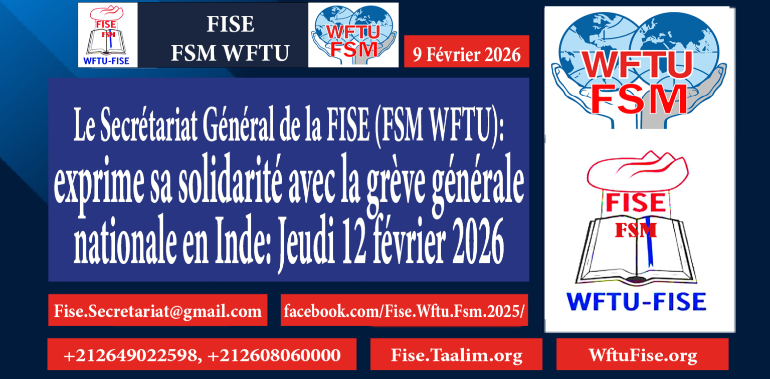 Communiqué de solidarité internationale du Secrétariat Général de la Fédération Internationale Syndicale de l’Enseignement FISE affiliée à la Fédération Syndicale Mondiale FSM, suite à la grève générale nationale en Inde le Jeudi 12 février 2026, lancé par les centrales syndicales indiennes