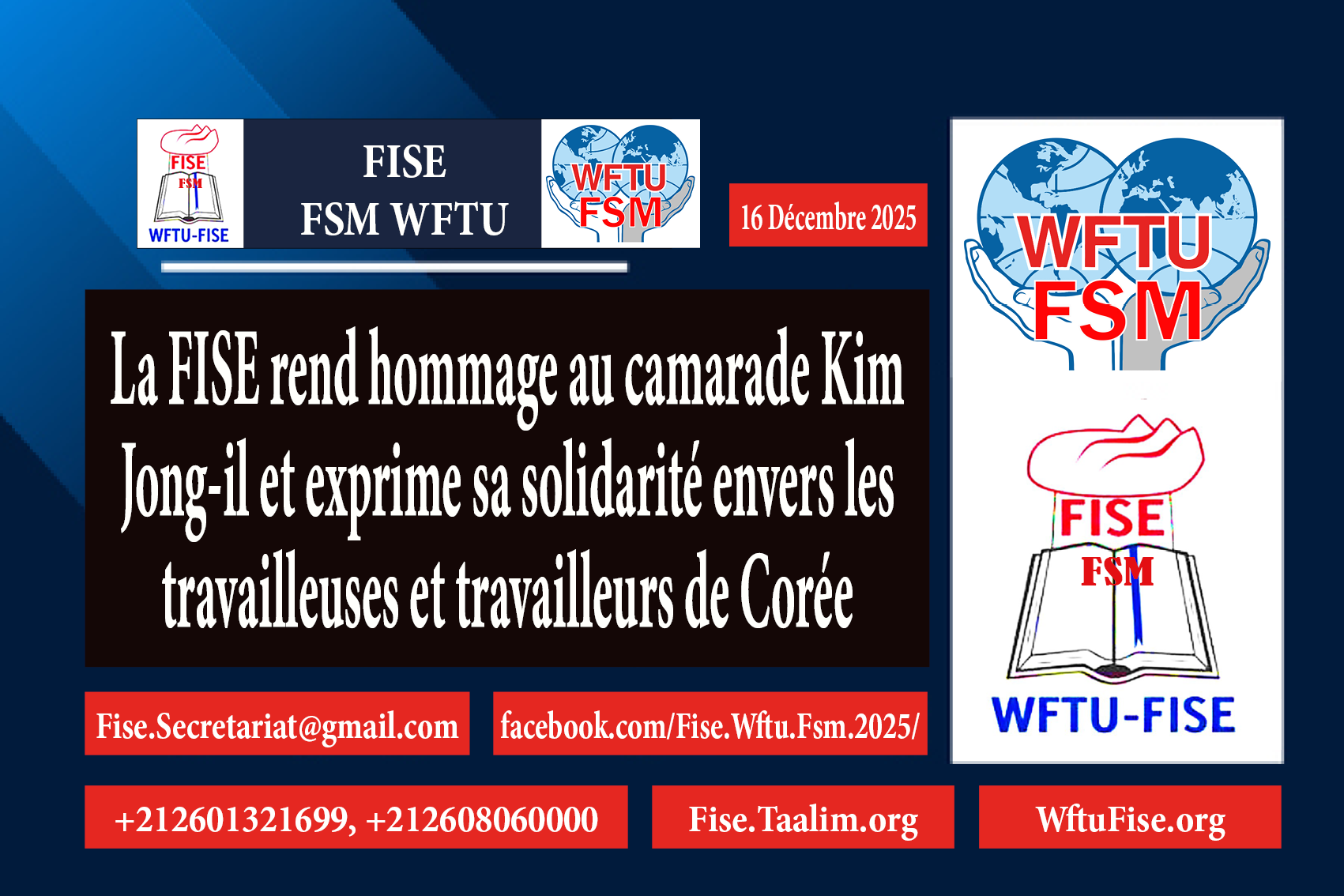 Le Secrétariat Général de la Fédération Internationale Syndicale de l’Enseignement FISE FSM WFTU rend hommage au camarade Kim Jong Il à l’occasion du 14e anniversaire de son décès, et exprime la solidarité internationale à la Fédération Générale des Syndicats de Corée FGSC GFTUK et Aux travailleuses et travailleurs de l’éducation de la République populaire démocratique de Corée
