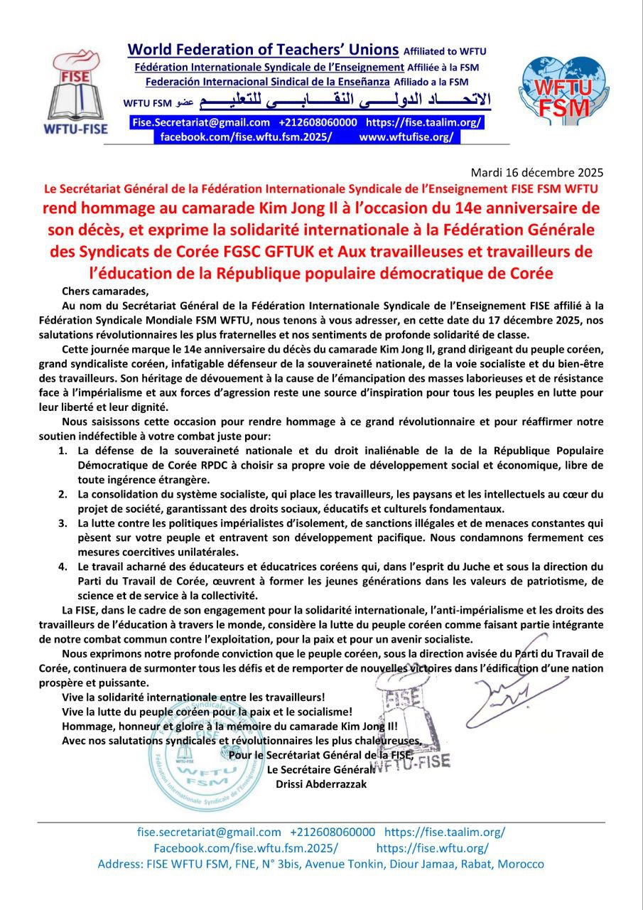 Au nom du Secrétariat Général de la Fédération Internationale Syndicale de l’Enseignement FISE affilié à la Fédération Syndicale Mondiale FSM WFTU, nous tenons à vous adresser, en cette date du 17 décembre 2025, nos salutations révolutionnaires les plus fraternelles et nos sentiments de profonde solidarité de classe.