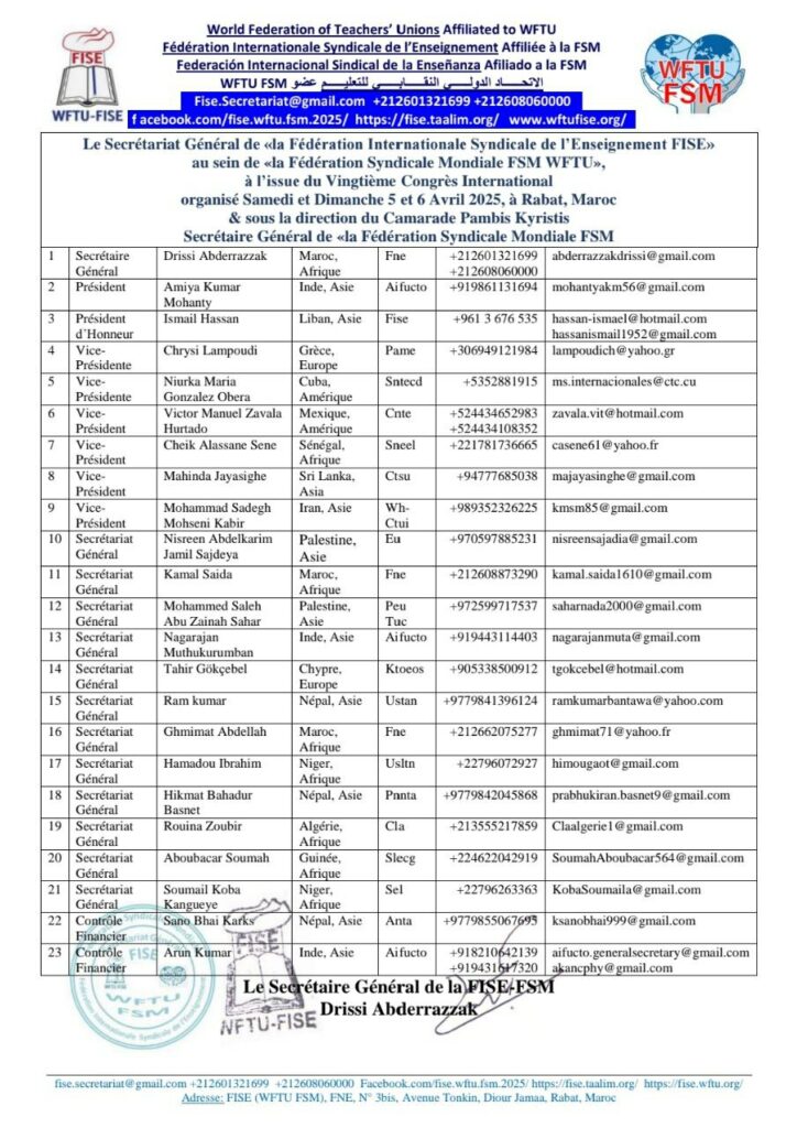 Le Secrétariat Général de «la Fédération Internationale Syndicale de l’Enseignement FISE»