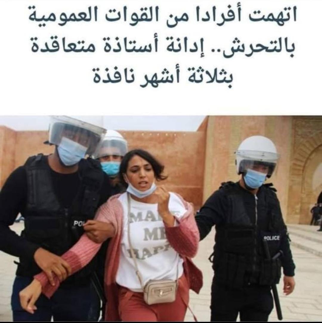Pour avoir organisé, en faveur d’une réforme de leur statut professionnel, des manifestations dans les rues de Rabat, qualifiées par le gouvernement de « rassemblements non autorisés » et de « violations de l’état d’urgence sanitaire », 70 enseignants contractuels marocains ont été arrêtés et poursuivis par la cours de justice de Rabat (60 par la cours de première instance et 10 par la cours de deuxième instance), dont 44 enseignants ont été condamnés à 2 mois de prison avec sursis et une jeune enseignante a été jugée à 3 mois de prison ferme pour « outrage envers un corps constitué » parce qu’elle a osé dénoncer un harcèlement sexuel par les forces de l’ordre lors d’une manifestation d’enseignants contractuels.
