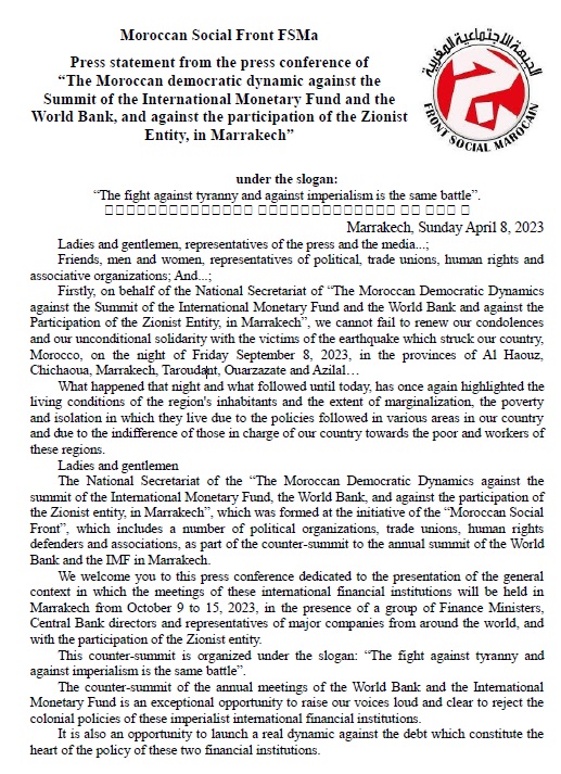 Moroccan Social Front: “The fight against tyranny and against imperialism is the same battle”