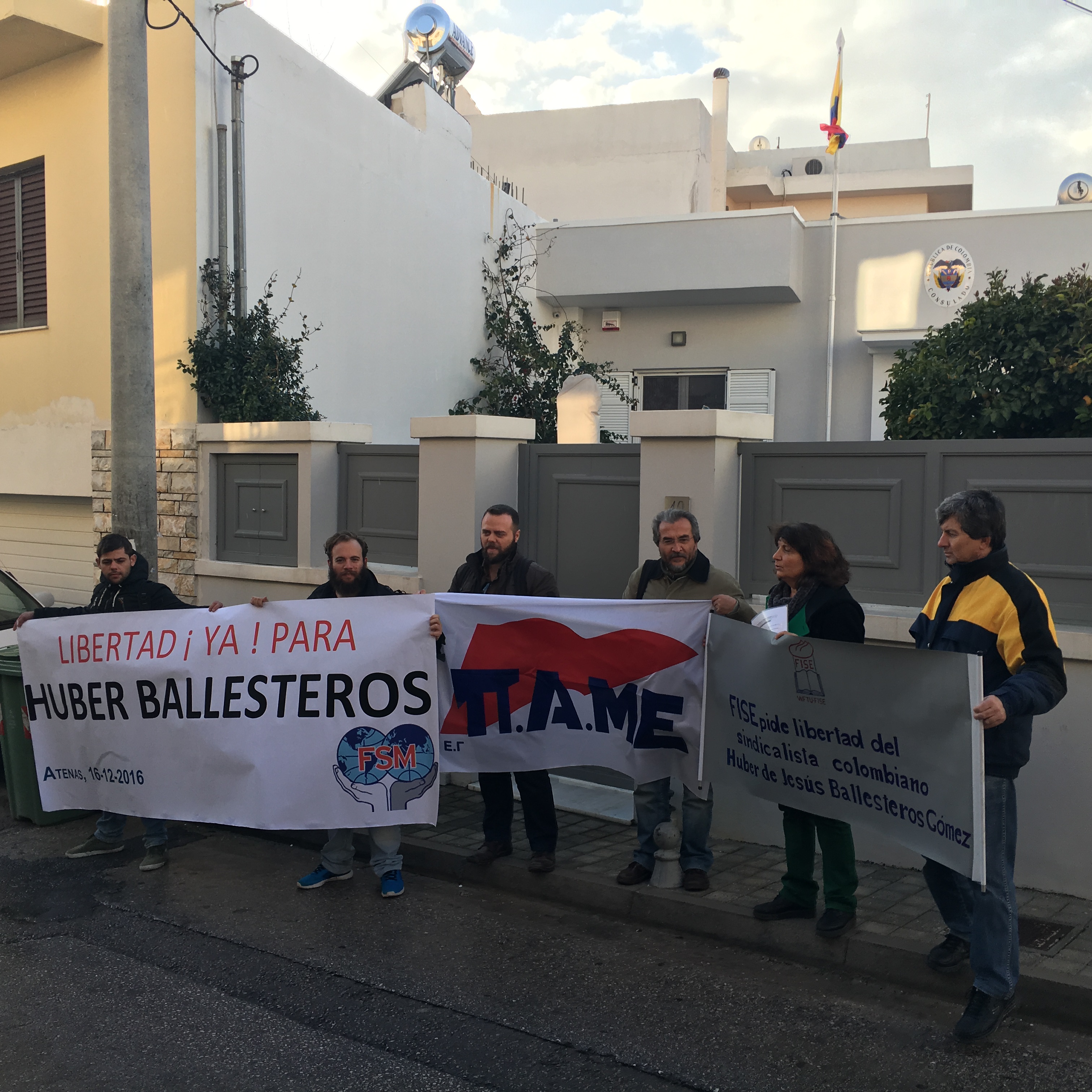 Protesta por la liberación del sindicalista colombiano Huber de Jesús Ballesteros Gómez, que ya está encarcelado por tres años para su acción política y sindical y que se juzga el lunes 19/12/2016, realizó hoy la Federación Internacional de la Enseñanza, FISE, miembro de la FSM, en la embajada de Colombia en Grecia.
